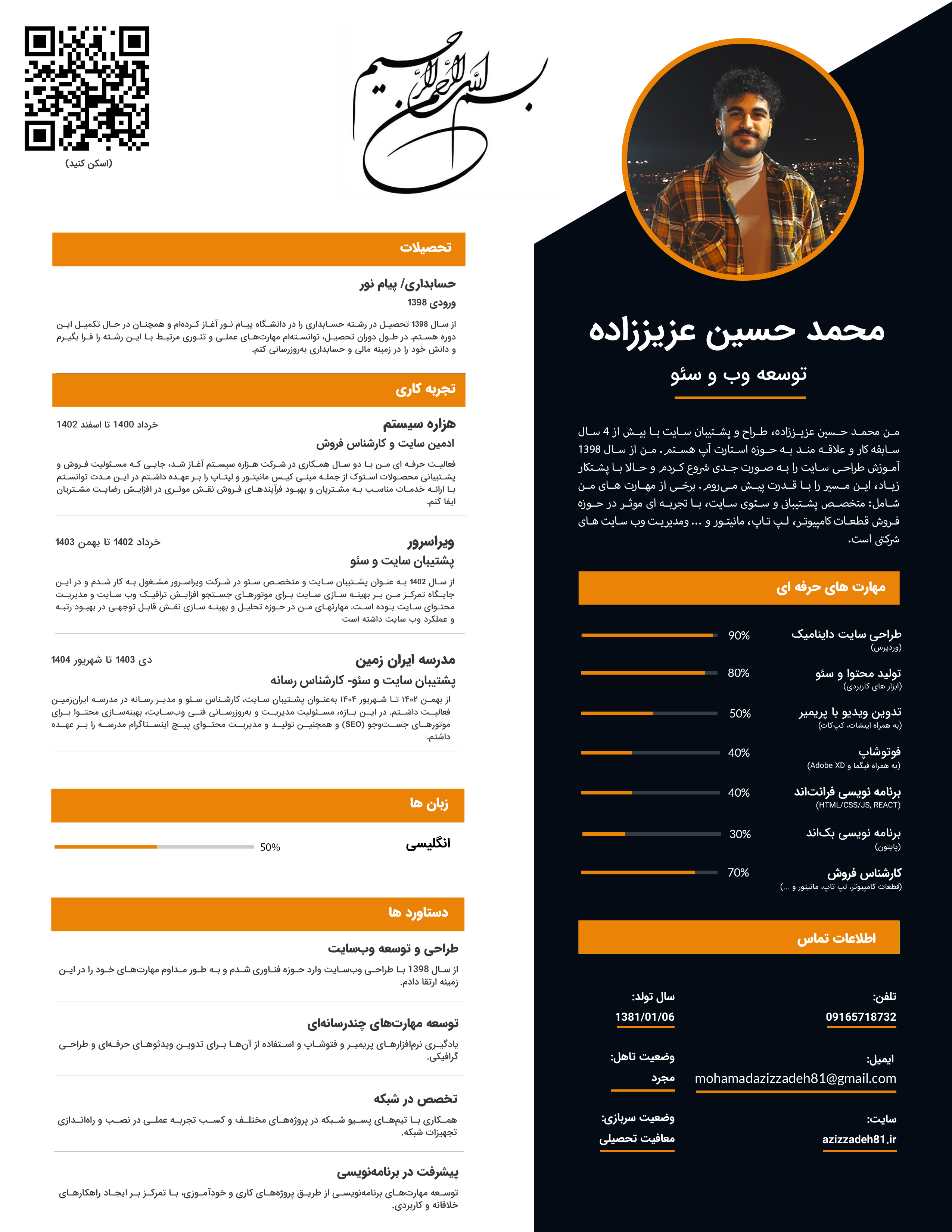 من محمدحسین عزیززاده، طراح و پشتیبان سایت با بیش از ۴ سال سابقه کار و علاقهمند به حوزه استارتآپ هستم. از سال ۱۳۹۸ آموزش طراحی سایت را بهصورت جدی آغاز کردم و حالا با پشتکار زیاد، این مسیر را با قدرت ادامه میدهم. در حال حاضر در زمینه برنامهنویسی فرانتاند فعالیت دارم و همچنین دارای مهارت در حوزه دیجیتال مارکتینگ شامل طراحی سایت، سئو و تولید محتوا هستم.